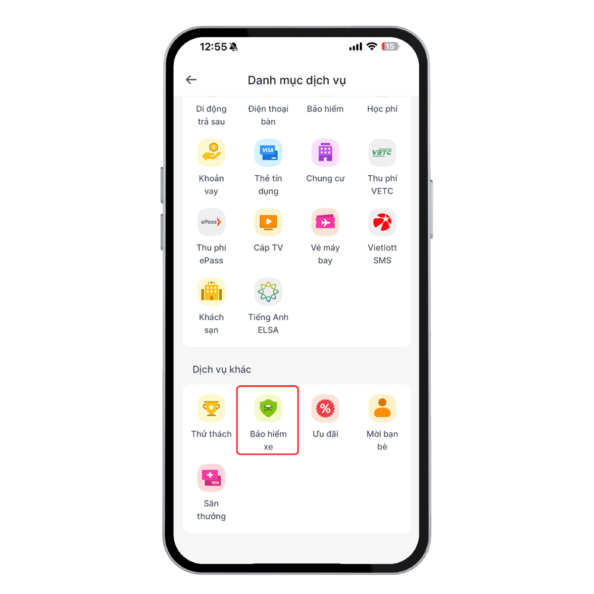Bước 1:Tại màn hình chính Cake, chọn “Bảo hiểm xe” trong mục “Danh mục dịch vụ"