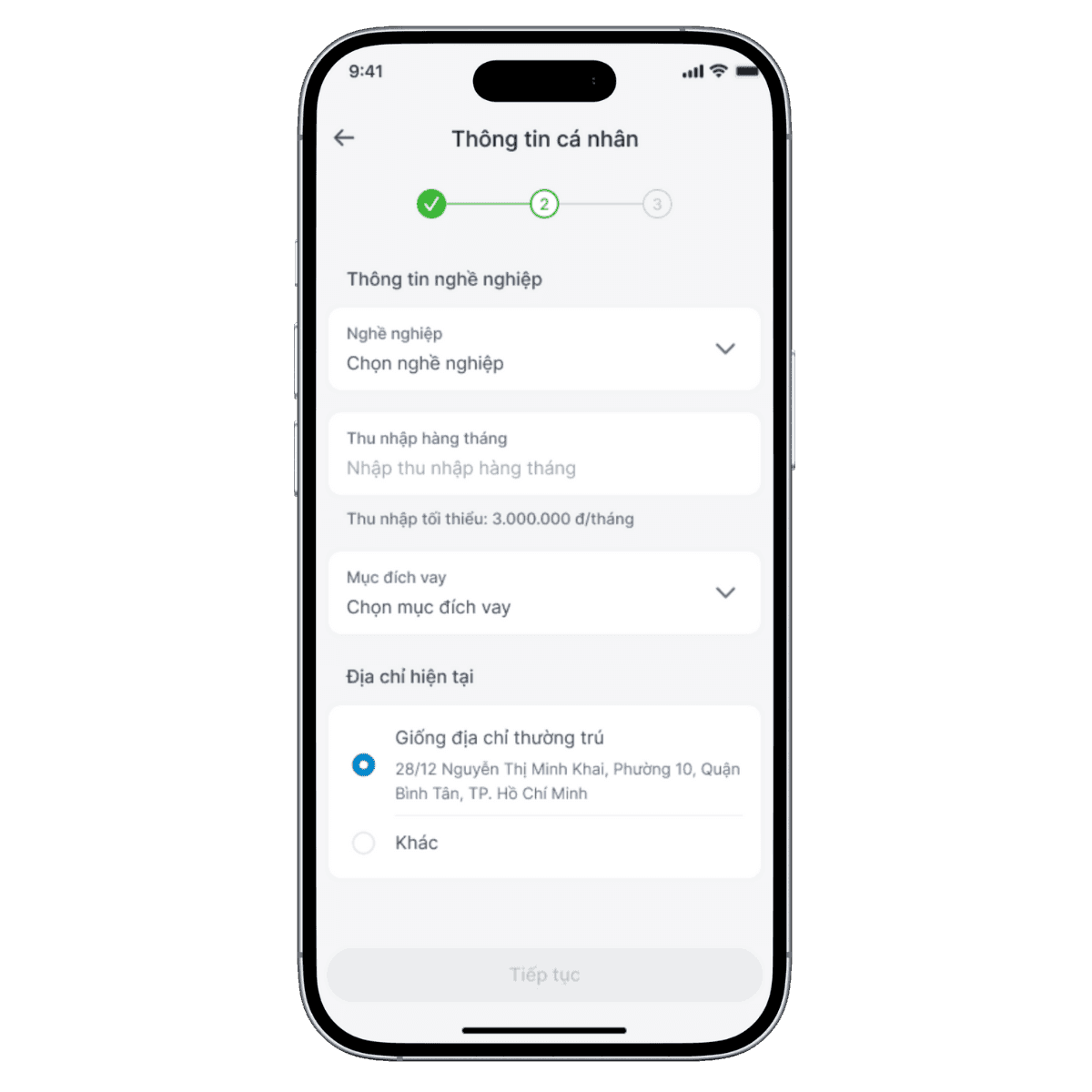 Bước 4:Bổ sung thông tin cá nhân, sau đó nhấn "Tiếp tục"